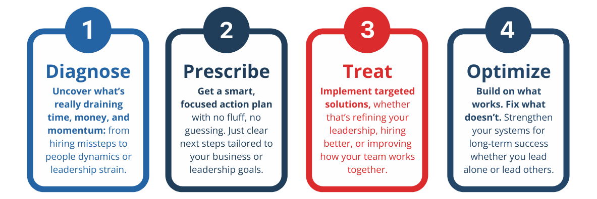 After completing any of these diagnostic assessments, you’ll walk away with a personalized action plan - whether it’s refining leadership, aligning key partnerships, hiring smarter, or strengthening your team.
